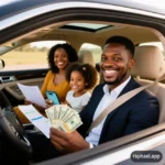 Pessoa angolana analisando contas e sorrindo, transmitindo alívio e controle financeiro.